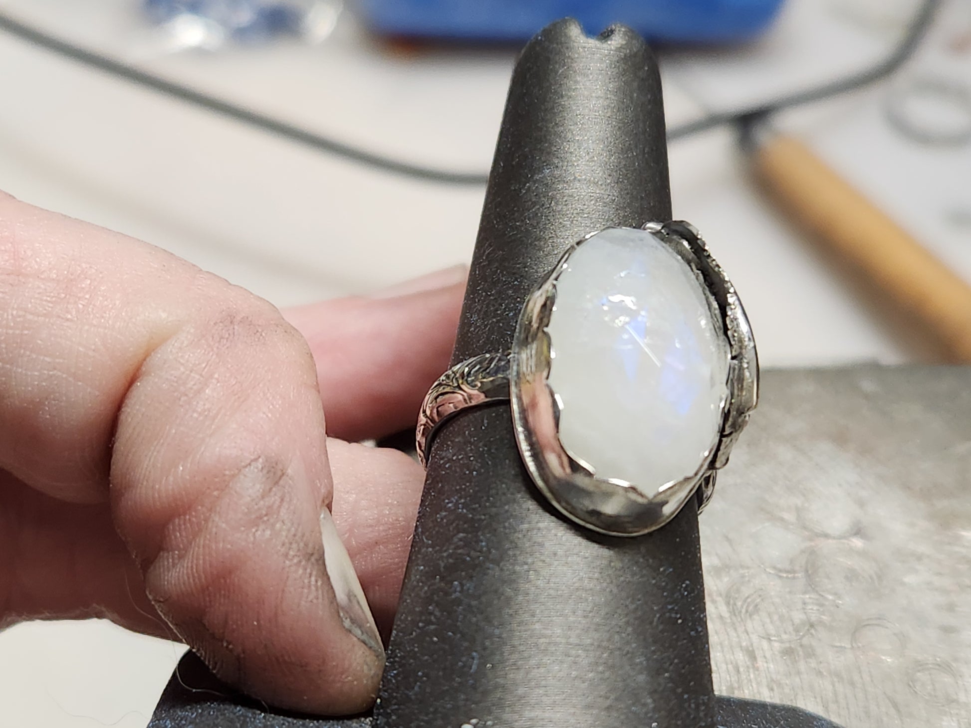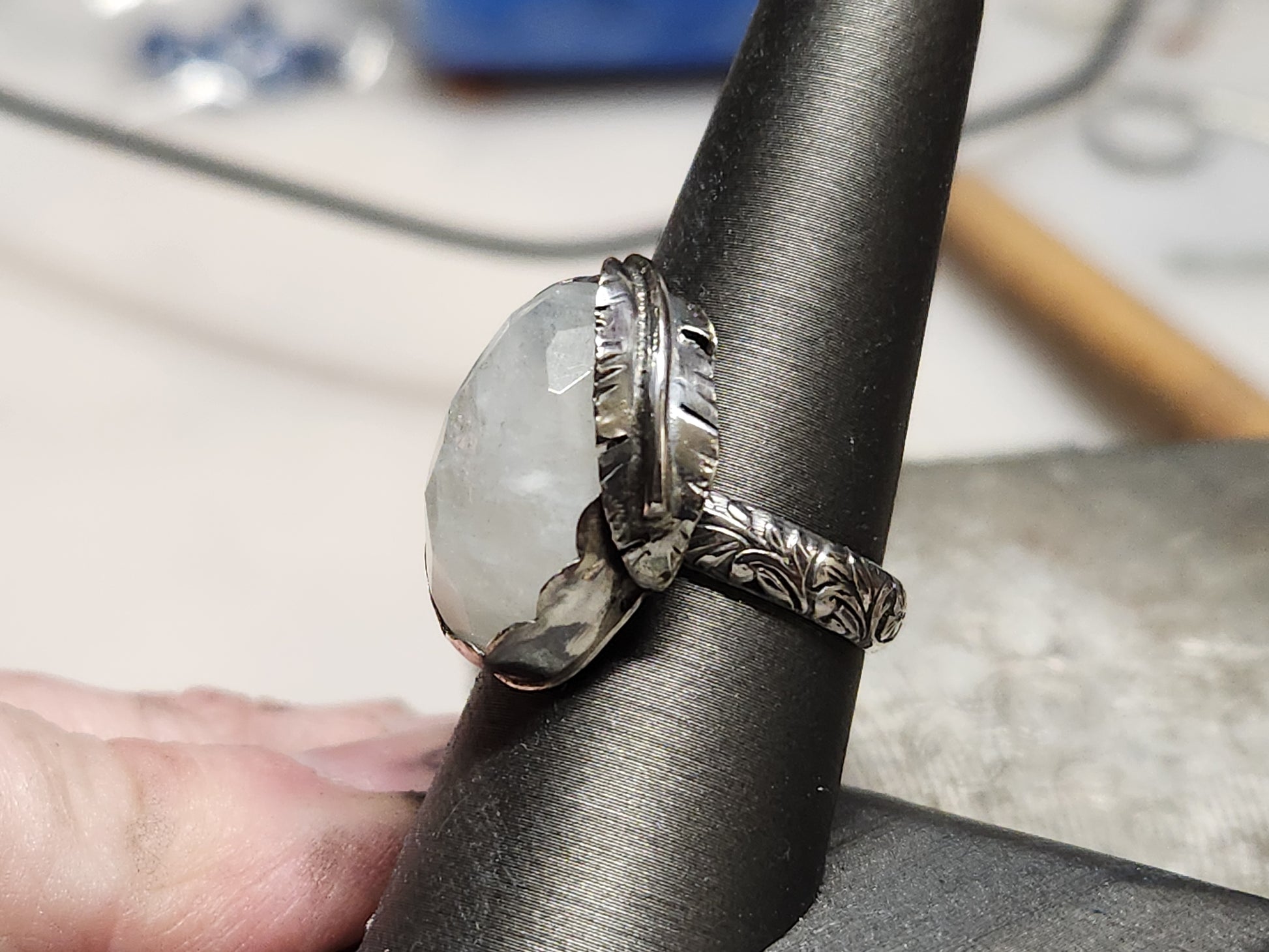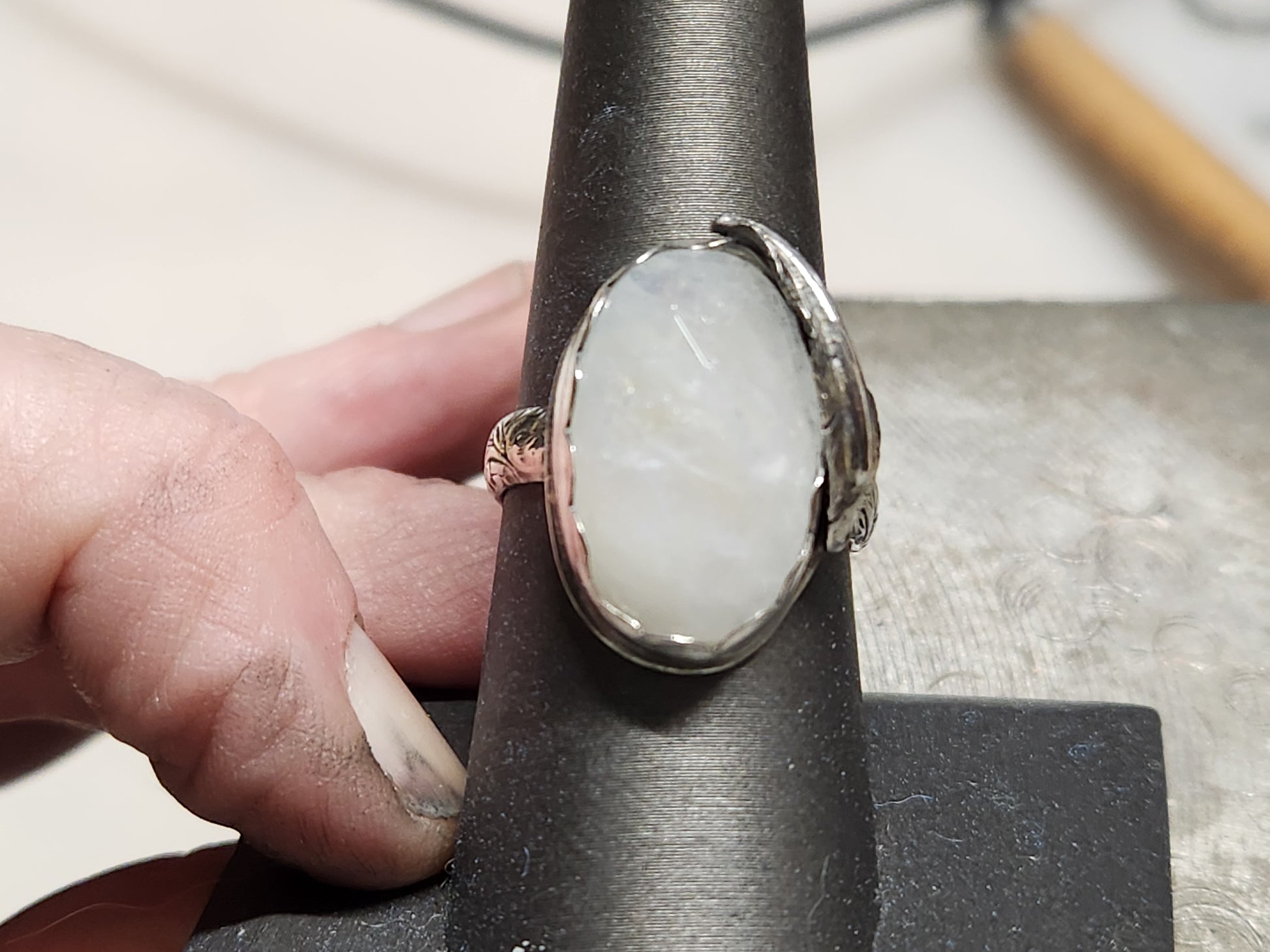 Adorn yourself with the ethereal beauty of our Moons of a Feather ring. Made with a floral, sterling silver band, and adorned with a stunning moonstone, this ring is truly one of a kind. Handmade and detailed with a sterling silver feather embellishment and patina finish, it's the perfect blend of nature and craftsmanship.