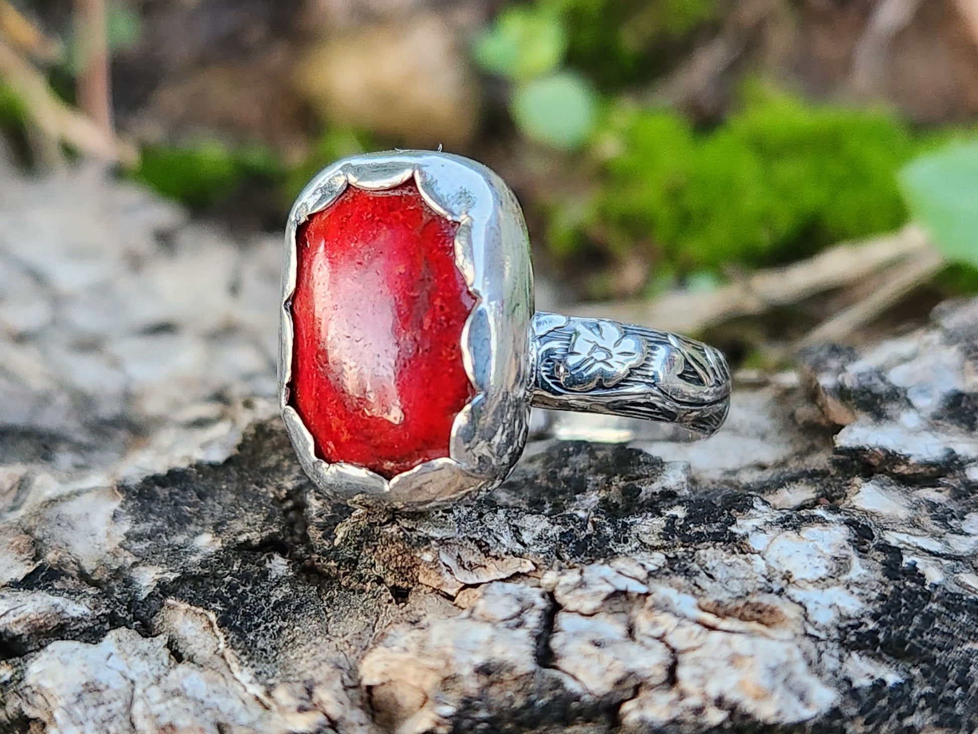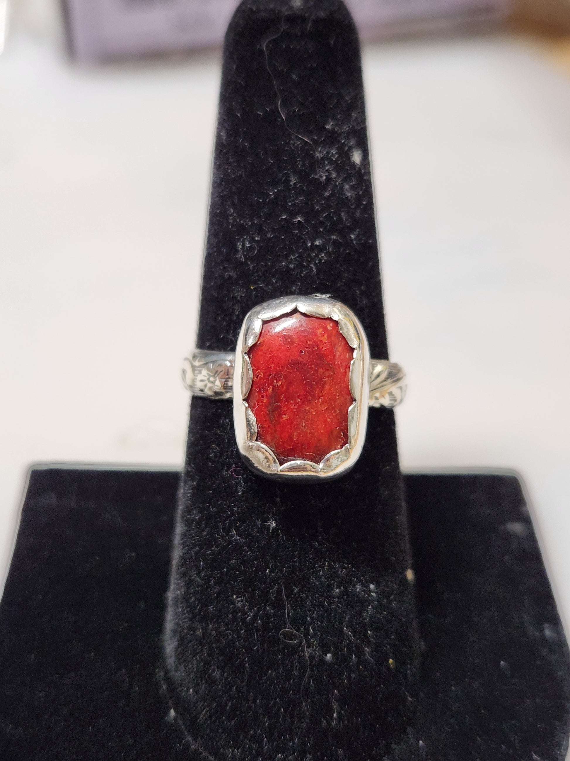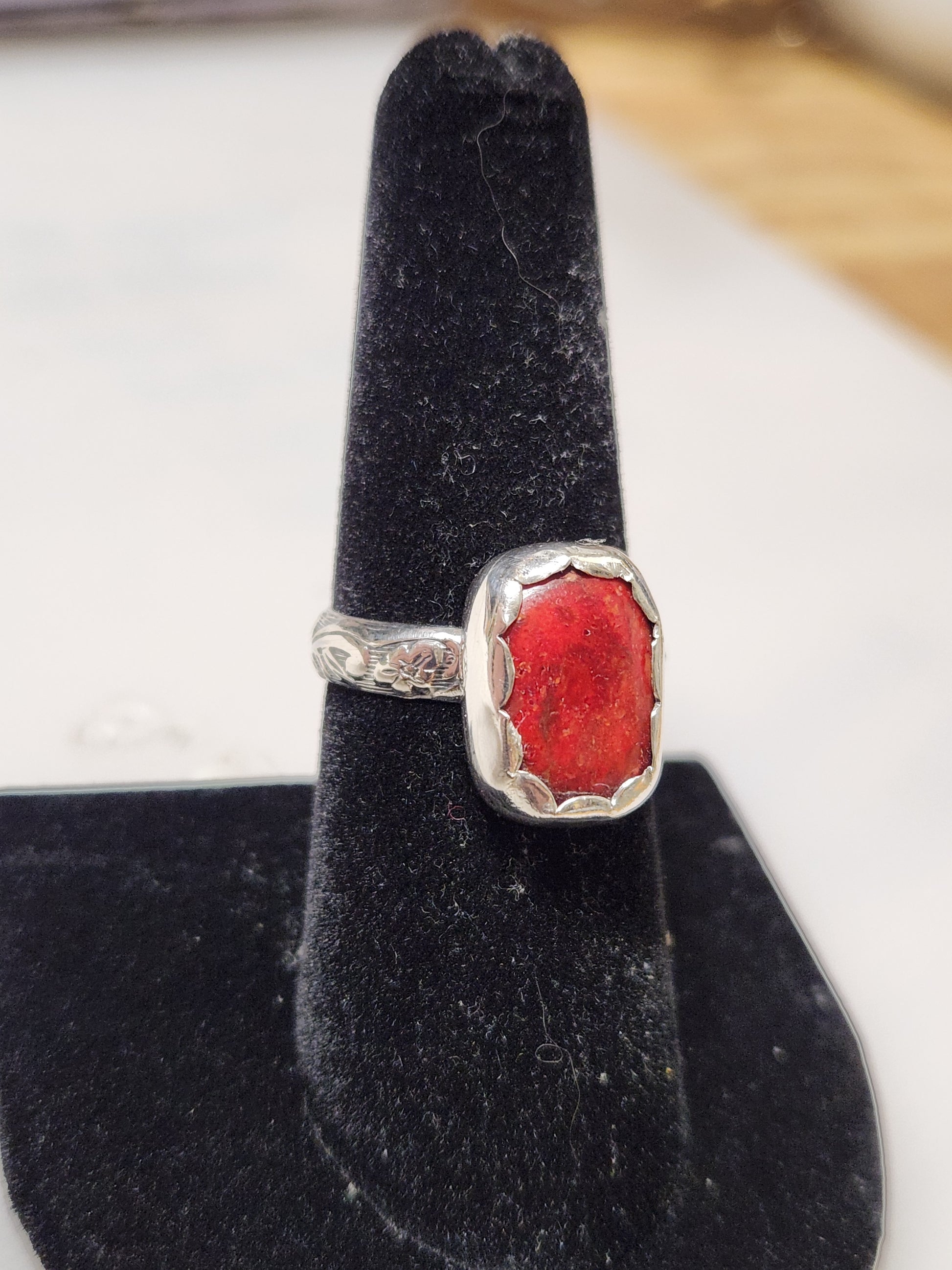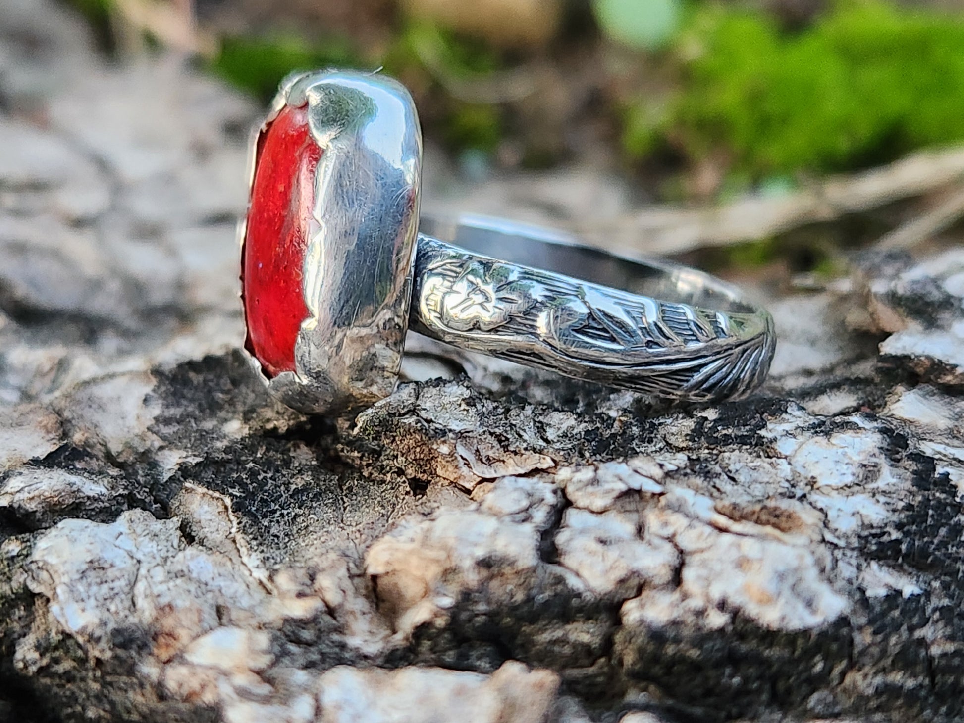 At this point you are singing along with me, or you are watching the movie in your head. Either way, you can thank me by looking at this pretty specimen of Red Coral set in 925 Sterling Silver. Just enough patina on the floral band to highlight the pattern and coning in just over a size 7. Own your own piece of the ocean with this cute 🪸 ring.